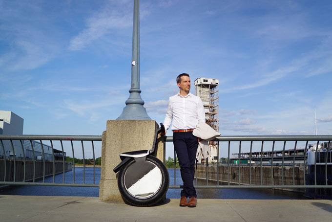The vehicle is operated by a rider – you have to bend forward to accelerate the movement and to lean back to slow down. To turn left or right, the rider needs to lean in the right direction. Accelerometers, gyroscopes and a microcomputer are responsible for the balance of the trip. The one-wheeled scooter is equipped with a lithium battery at 10 amps powering a 500 watt brushless motor that can develop a maximum speed of 25 km/h.